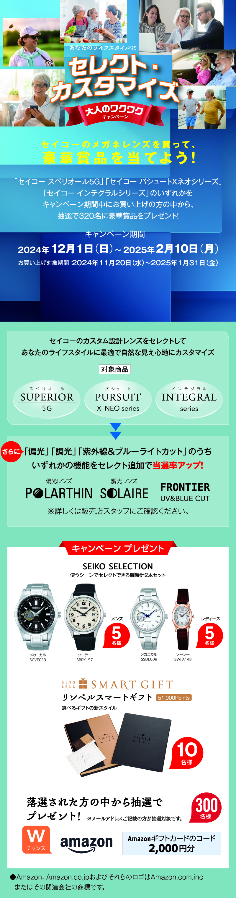 ●本キャンペーンはセイコーオプティカルプロダクツ㈱による提供です。本キャンペーンについてのお問い合わせはAmazonではお受けしておりません。「大人のワクワクキャンペーン」キャンペーン事務局(sop-campaign@seiko-opt.co.jp)までお願いいたします。●Amazon、Amazon.co.jpおよびそれらのロゴはAmazon.com,incまたはその関連会社の商標です。